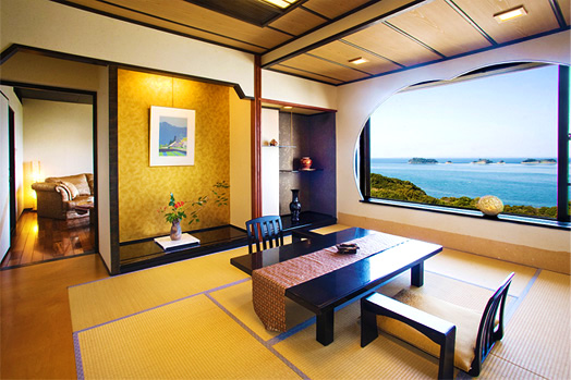 室内に踏み入れると、どこからも景色を楽しめる客室。回遊できる室内空間は ダイナミックな視界の広がり 展開する空間の変化の楽しさ。