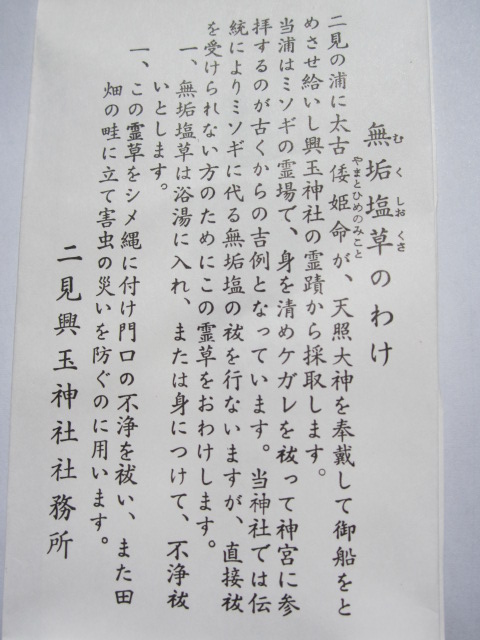 二見興玉神社の無垢鹽草(むくしおくさ)です。不浄祓いに良いそうです。